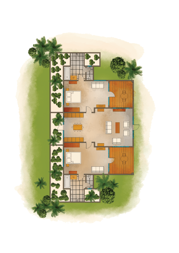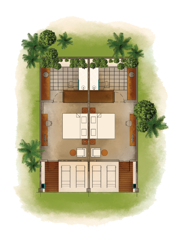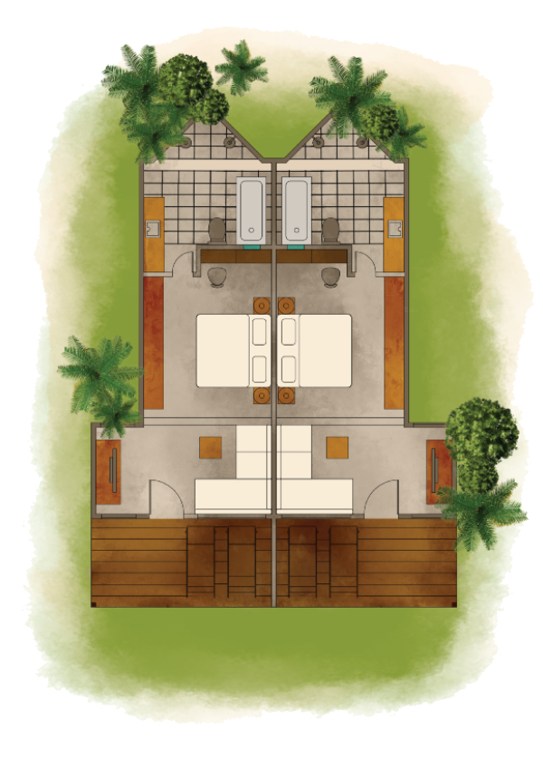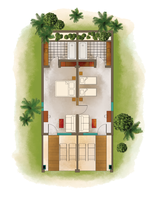 Состоят из двух спален (одна с двуспальной кроватью king-size, другая с двумя односпальными кроватями); зоны для дневного отдыха; двух ванных комнат под открытым небом с ванной и тропическим душем; двух террас с шезлонгами.
