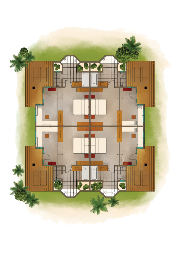 Площадь — 68 кв.м. Смежные виллы, по 4 номера в блоке. Расположены в центре острова, среди тропической растительности, в непосредственной близости от бассейна и в нескольких шагах от пляжа.
