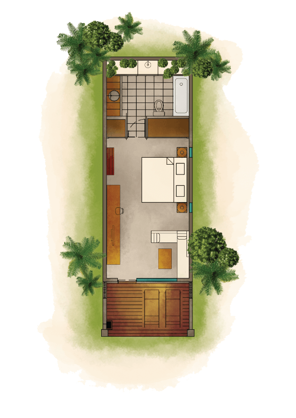Состоят из спальни с кроватью king-size; гостиной зоны с диваном; ванной комнаты под открытым небом с 2 тропическими душами и ванной; террасы с шезлонгами. Максимальное размещение: 3 взрослых и 1 ребёнок.