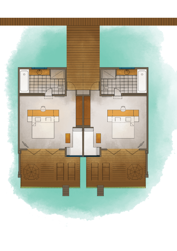 Состоят из спальни с кроватью king-size; гостиной зоны с диваном; ванной комнаты на открытом воздухе с ванной и тропическим душем; террасы с шезлонгами и мальдивскими качелями.